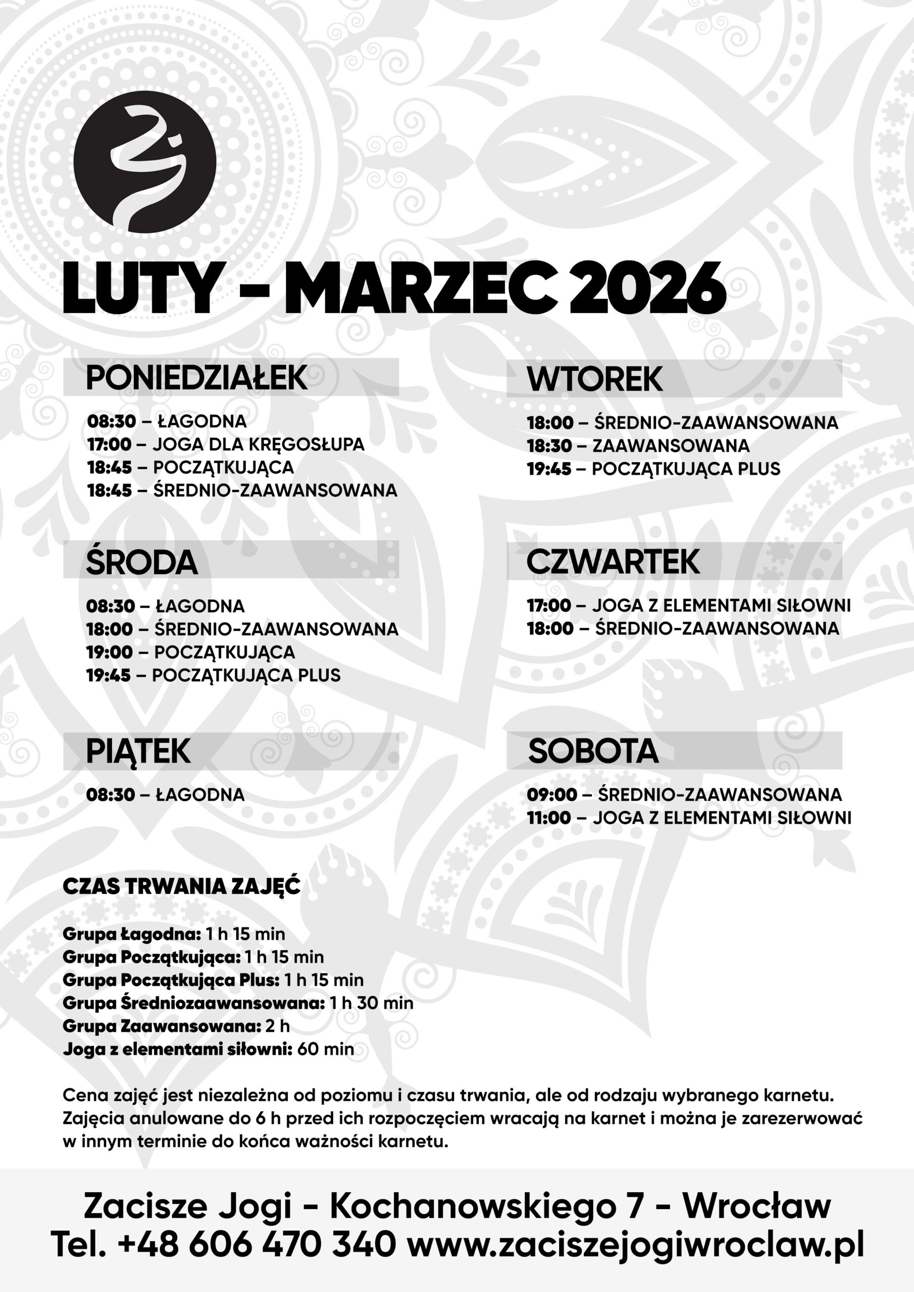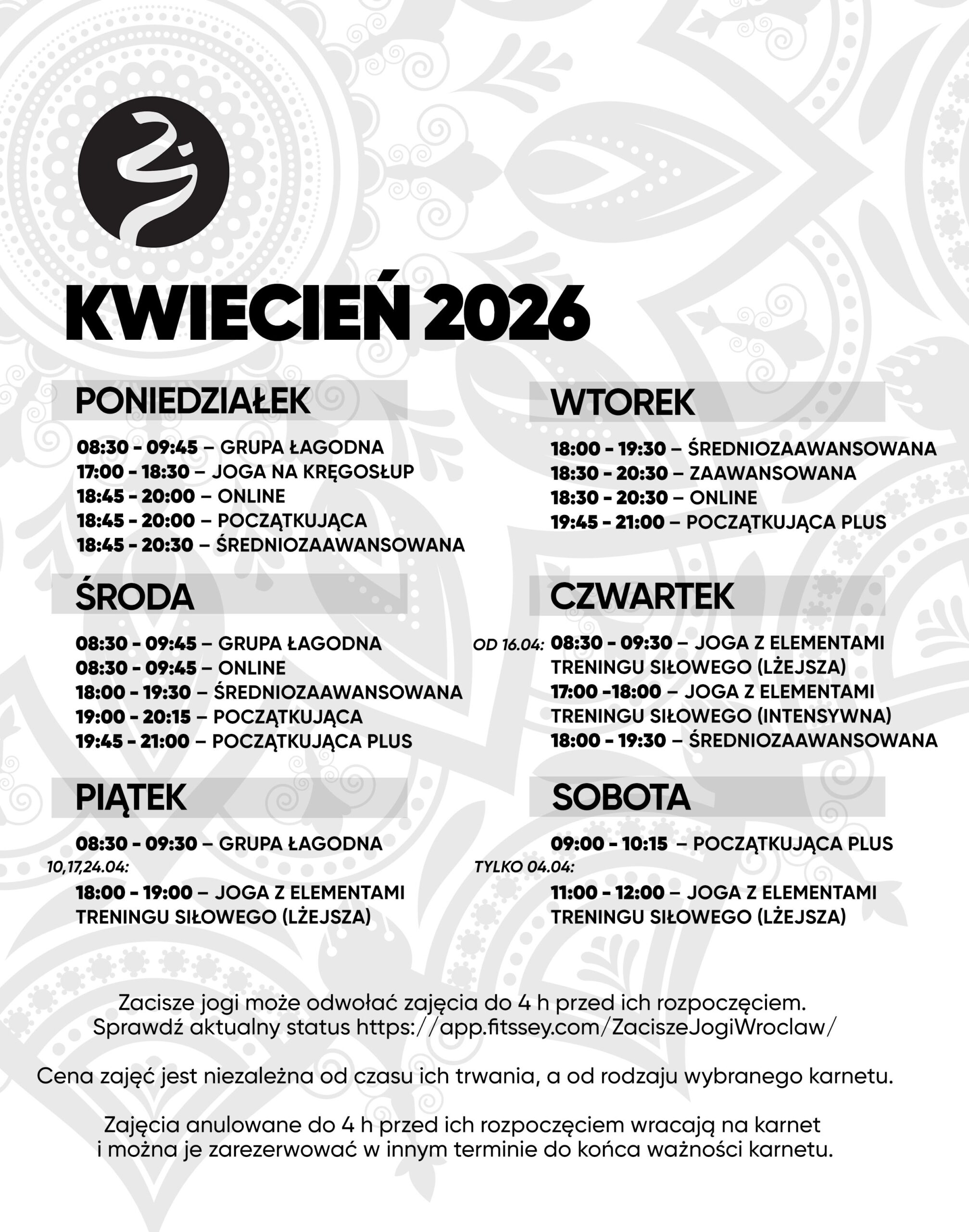 Ważne!Zacisze jogi może odwołać zajęcia do 4 h przed ich rozpoczęciem, w przypadku gdy nie zbierze się minimalna ilość 5 osób.Sprawdź aktualny status: https://app.fitssey.com/ZaciszeJogiWroclaw/ Rezerwuj zajęcia Indywidualne Joga Online Regulamin Zacisza Jogi Wrocław Pierwszy raz w Zaciszu jogi? Osoby, które chcą przyjść do nas na zajęcia próbne pierwszy raz, prosimy o wcześniejszy kontakt telefoniczny lub SMS 606 470 340, podając datę i godzinę wybranych zajęć.Cena pierwszych zajęć jest niższa i wynosi 40 zł.